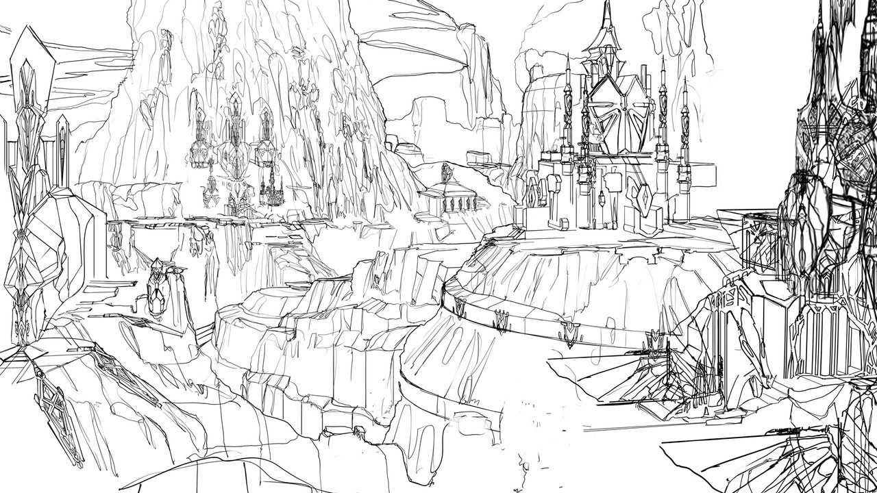 Ryan: It depends on the purpose and level of design. For instance, in visual development it needs to tell the story, which can be done through various things like architectural language, scale, and setting. But for a hero piece, I would actually say a strong focal point is the most important. For example, on this piece, I had defined architectural language, scale, and setting, but something was still not right with my image. I couldn’t figure out what it was. My composition was balanced, the depth values were correct and the lighting was solid, but it wasn’t working. I stepped away from it for a while, and went back and blurred the image, and it suddenly dawned on me: I had no strong focal point. I loved each building so much they were almost holding equal footing in the painting. I revised it to bring out the bottom left tower and pushed everything else into the background, and suddenly it worked.