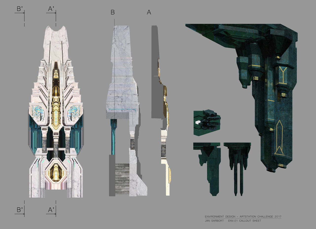 For this challenge, participants had to design not one but two unique environments that fit within the theme of Ancient Civilizations: Lost & Found. The submission also had to include a callout sheet containing elements that make up the final rendered environment. In a production environment, beautiful, fully-rendered environment concepts serve to sell the overall mood of the space so the call outs of those rendered environments needed to be able to serve as the blueprints for the art team to model specific elements, and for the purpose of the challenge, show your design process behind each location.