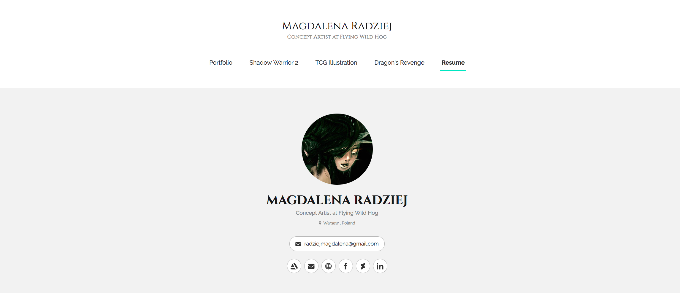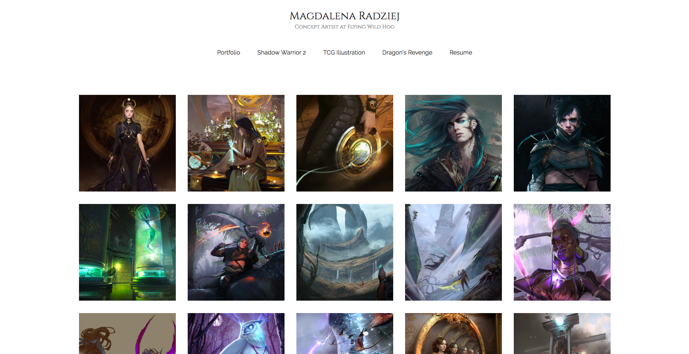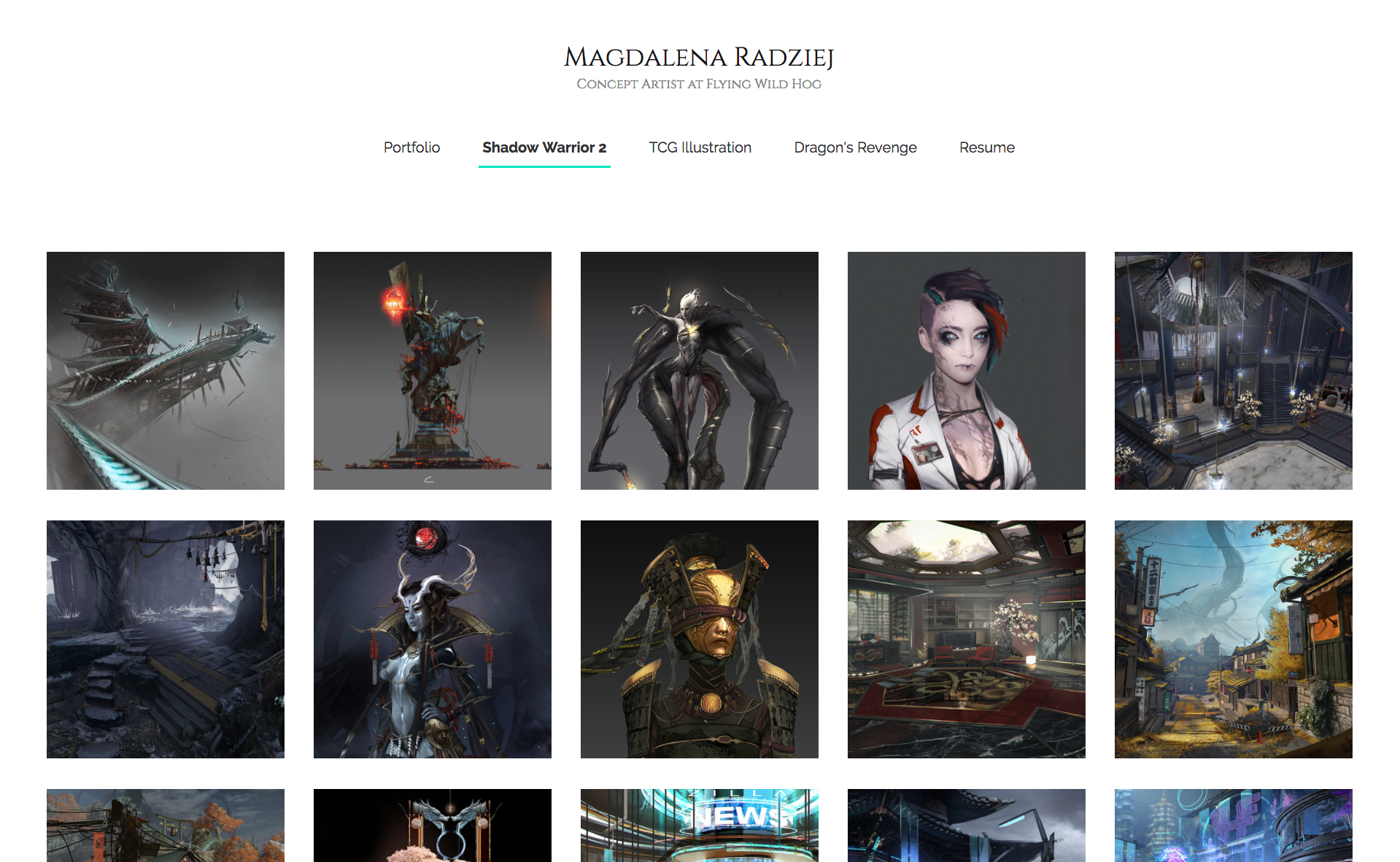 The ArtStation Pro Insta theme pays homage to Instagram with its simple and minimalist design. For concept artist Magdalena Radziej, it’s the perfect way to put all the focus on her striking artwork. Currently based in Warsaw, Poland, she has spent the last couple of years working at Flying Wild Hog game studio where she worked on Shadow Warrior 2.