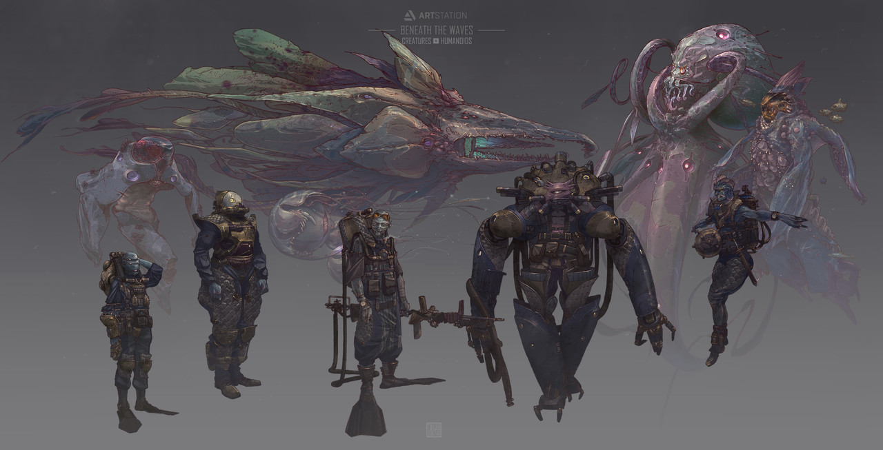 In the Beneath the Waves Creature/Character Design Challenge, participants had the daunting task of creating 10 underwater designs: 5 humanoids and 5 creatures.  Each humanoid character  had to tell their own story with their clothing, adornments, and gestures and each creature had to serve purpose in the story and draw inspiration from the real world.