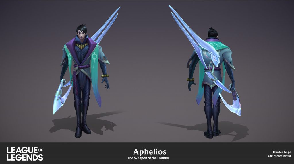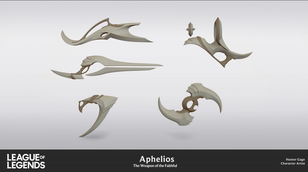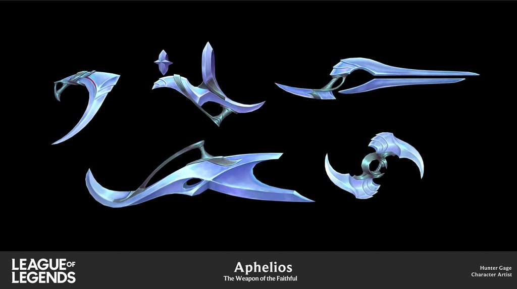 Our latest creation, Aphelios, was a larger champion than most. With a constantly changing kit, we were challenged to create an easily recognizable character, no matter how many times he switches weapons and varies silhouettes.
