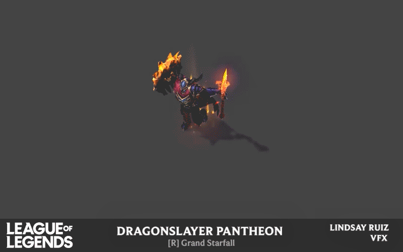 Pantheon bridges elements from Runterra’s Mt. Targon which use star, and constellation shapes to denote their power source. One particulate challenge was bridging the magical source of power into the physicality that Pantheon’s kit needed. In the Dragon Slayer Pantheon skin his ultimate grows huge dragon wings as he flies in with a wave of fire for his new ultimate