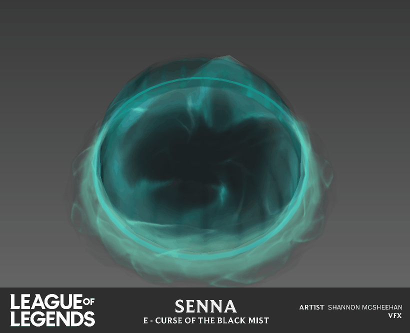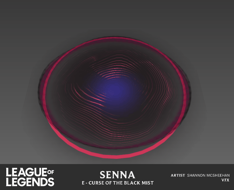 Senna’s is another champion who uses the Black Mist. Stencil tech was used heavily to represent different areas of visibility to really immerse yourself in the vision shroud the black mist provides. Senna was tied into the World beat this year which was a new music group called True Damage. Senna’s skin pulled in popping shapes, halftone treatment, and heavy use of chromatic aberration.