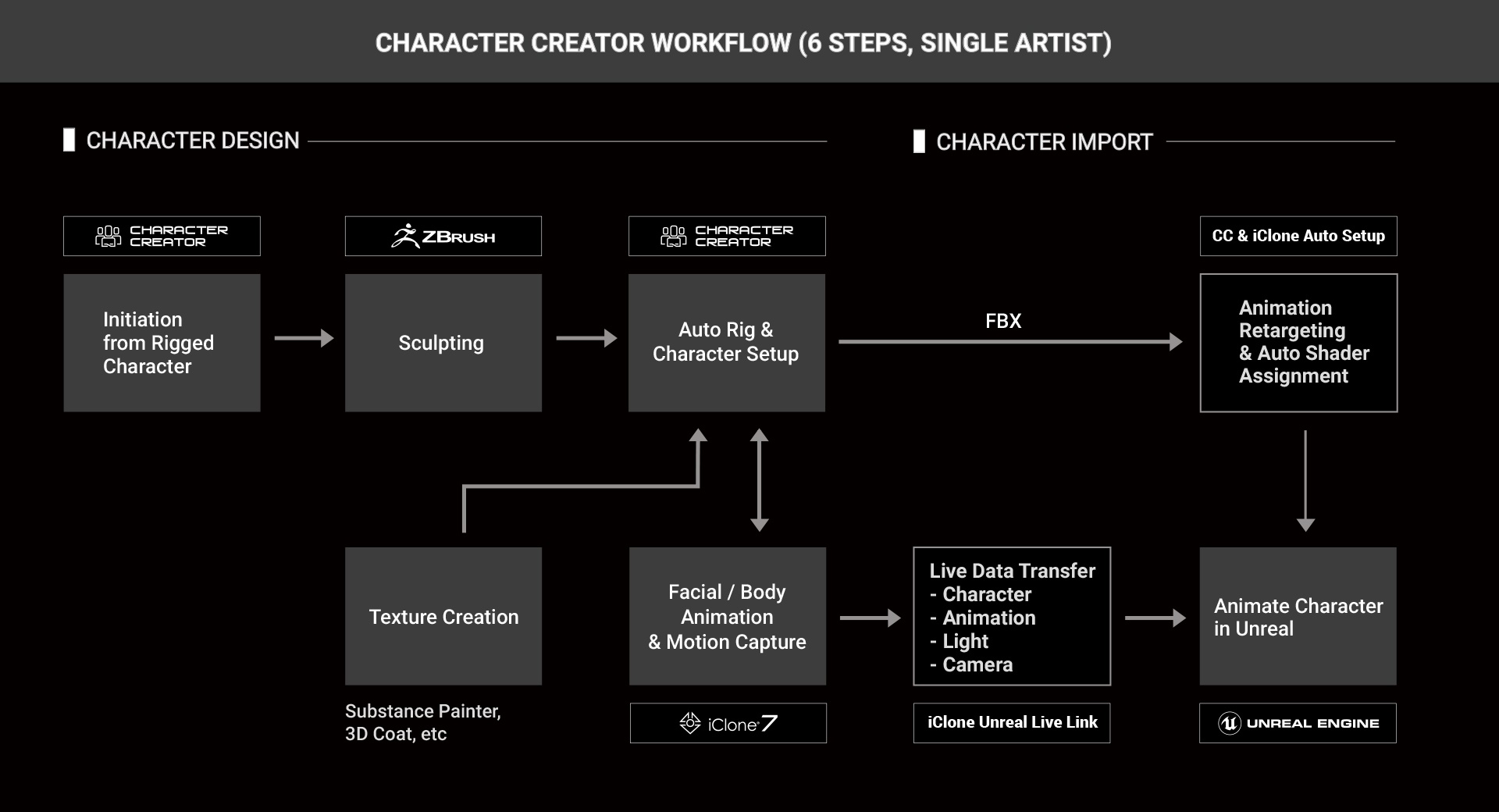 CC/ZBrush designed characters are fully iClone compatible for live facial-and-body MoCap performance. Apart from FBX export, 3D artists can use iClone Unreal Live Link to one-click transfer characters to Unreal Engine with auto-assigned digital human shader. In addition, face, body, cameras and lights are able to be controlled in Unreal Engine via iClone.