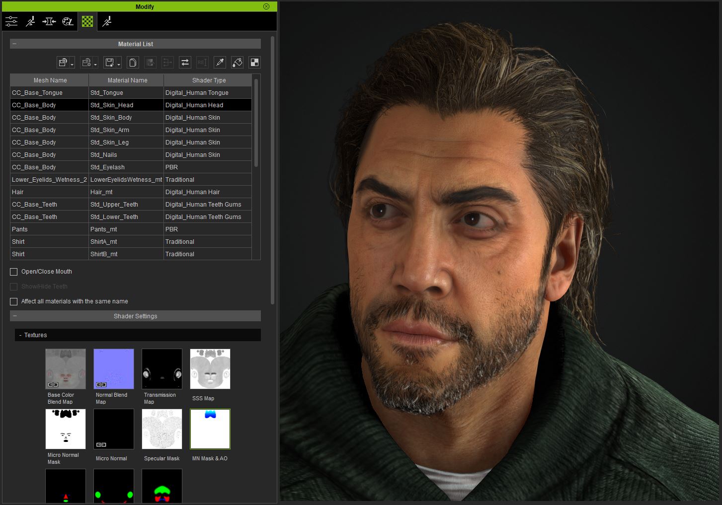 Character Creator adapts the Digital Human Shader to the real-time engine. Subsurface Scattering (SSS) is one of the keys to make characters look fabulous, and Micro Normal can present the best visuals on characters when zooming in and out. Besides human skin, teeth, tongue, eyes, and hair will look much better after applying the new shader.