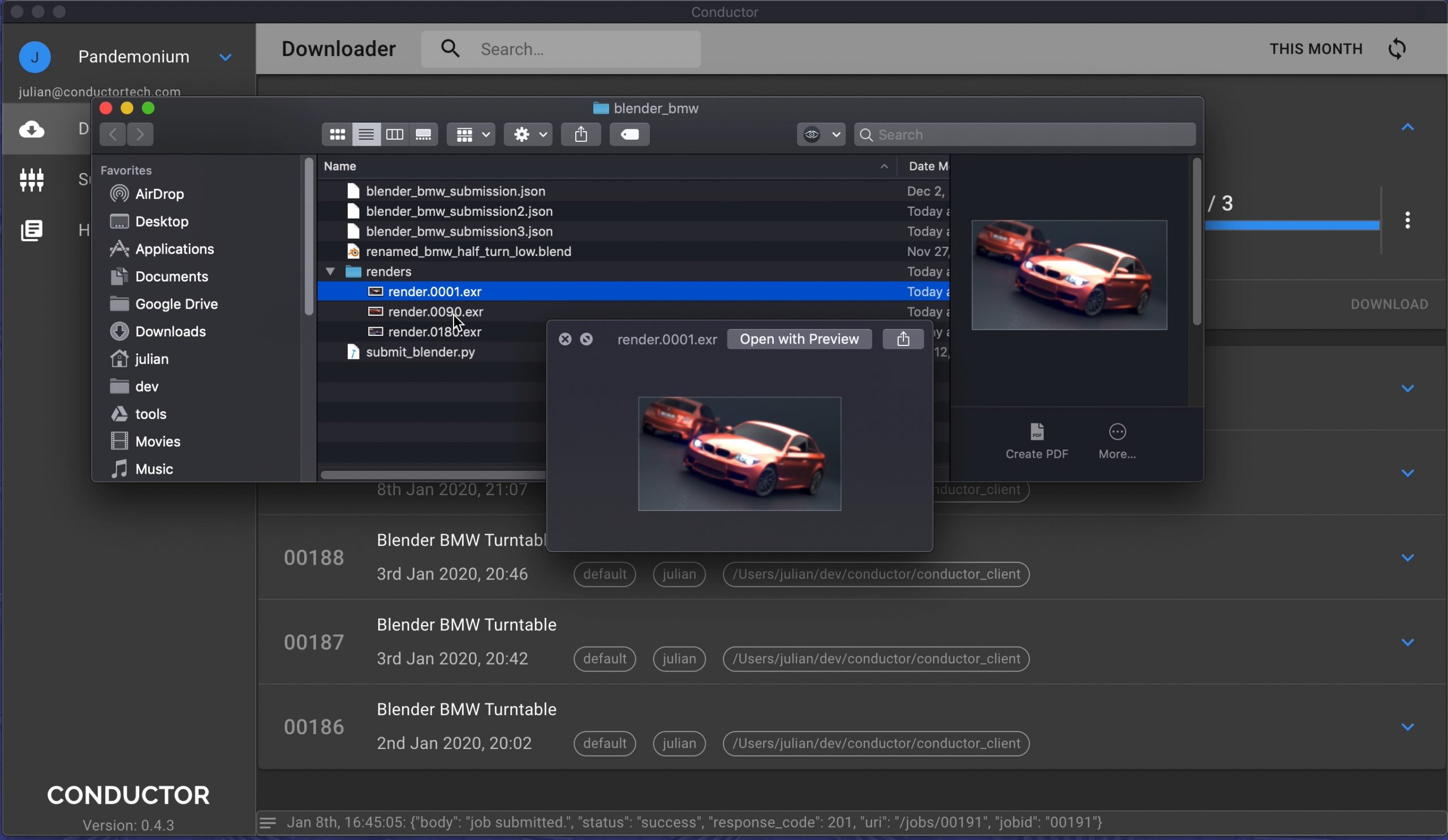 Companion is a complementary solution to the Conductor platform. Companion was developed to simplify the Conductor cloud-rendering experience in response to user feedback and strong demand from boutique studios and freelance artists. It was recognized that not every content creator has access to infrastructure specialists, so the Companion desktop application streamlines Conductor’s on-ramp and rendering, allowing users to easily manage and download files, write commands, and handle custom submissions or plug-ins right from their laptops or workstations.