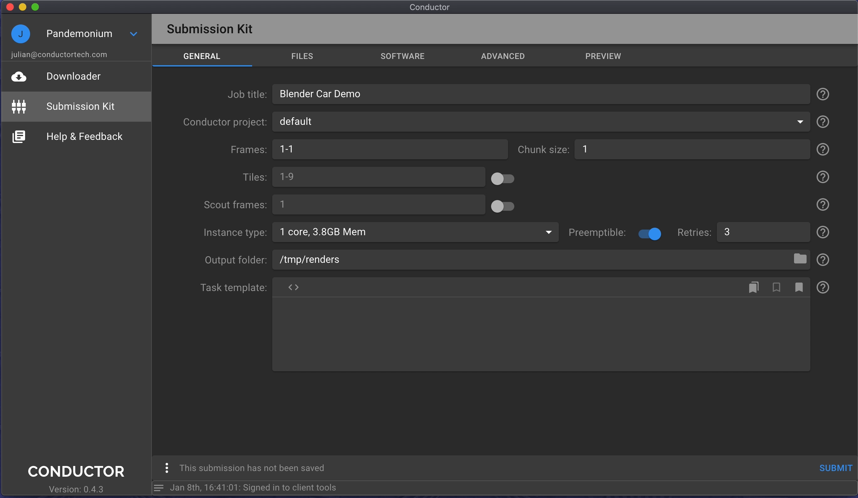 If you’re new to Conductor, you’ll need to create a login, otherwise you can log in to Companion with your existing account. Once logged in, you’ll be brought to a help and feedback page with useful links for things like documentation, accessing the web dashboard to view any jobs you’ve submitted, and links to submit a support ticket or provide feedback if you need additional assistance. The navigation panel on the left will take you to the custom submission and downloader windows.